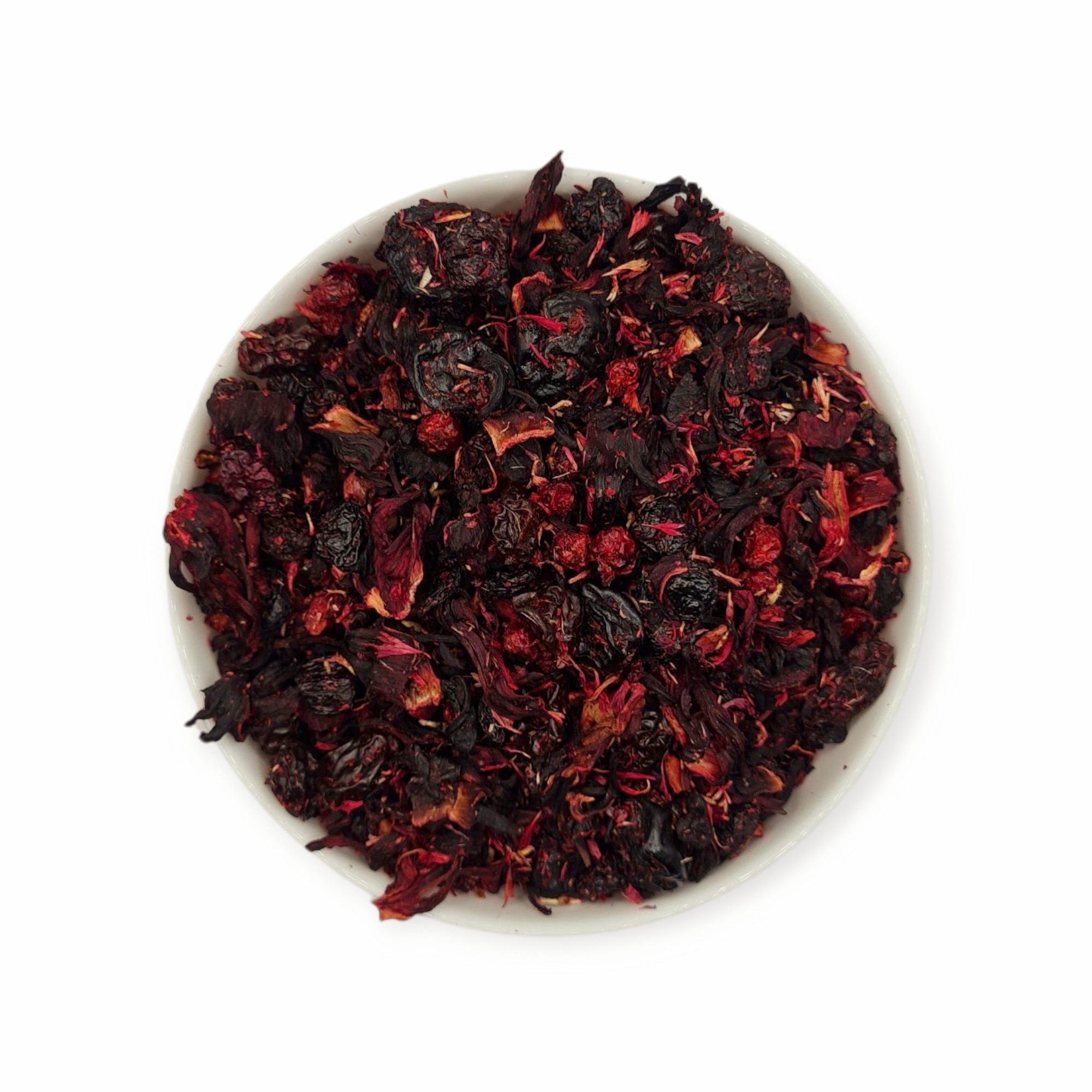 Składniki: wiśnia suszona (37,5%), hibiskus, rodzynki (rodzynki, olej roślinny), porzeczka czerwona liofilizowana, aromat, wiśnia liofilizowana (2%), płatki bławatka różowego.
