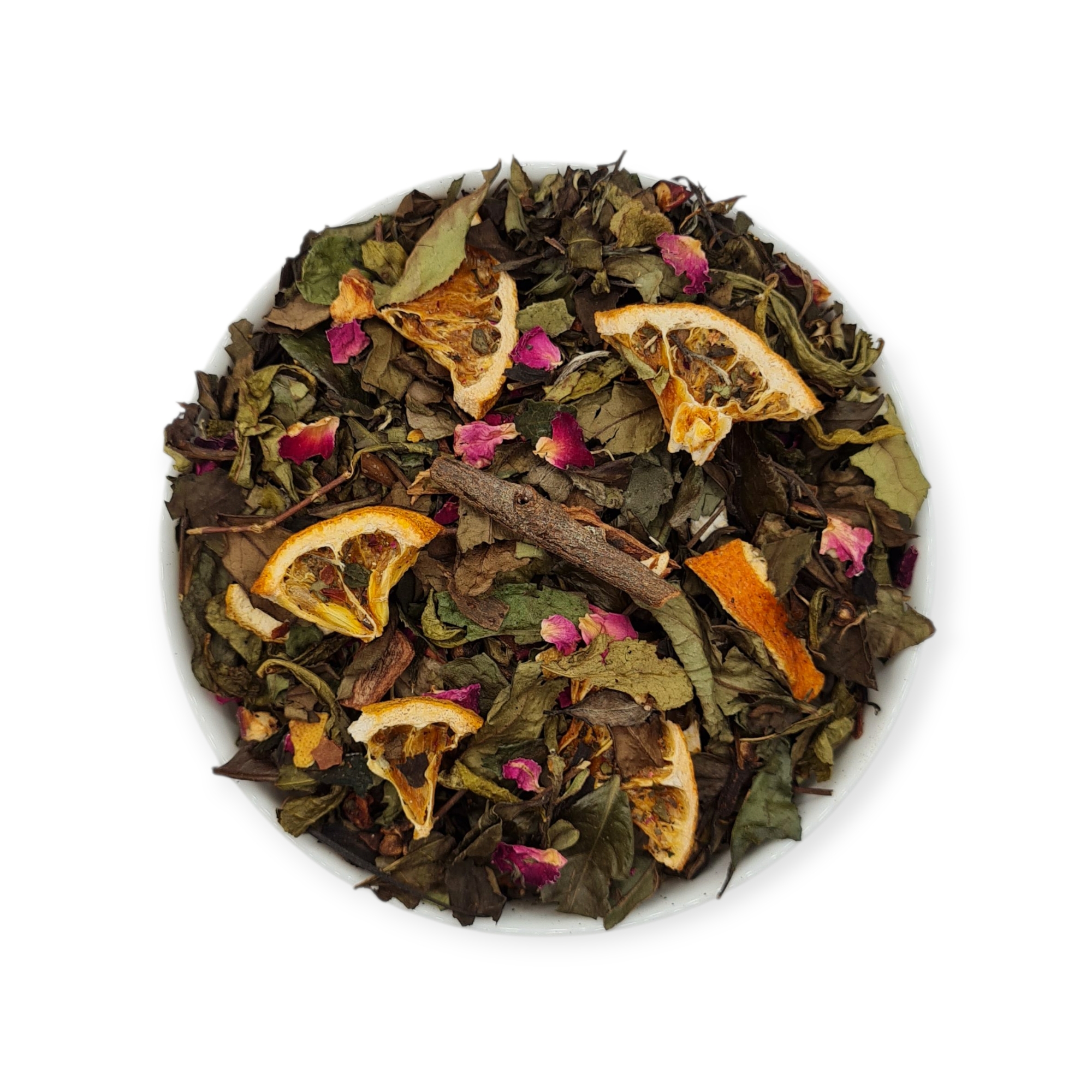 Składniki: herbata biała Pai Mu Tan, suszone jabłko, suszona mandarynka, kora cynamonu, suszona skórka cytryny, goździki, aromaty, płatki róży.