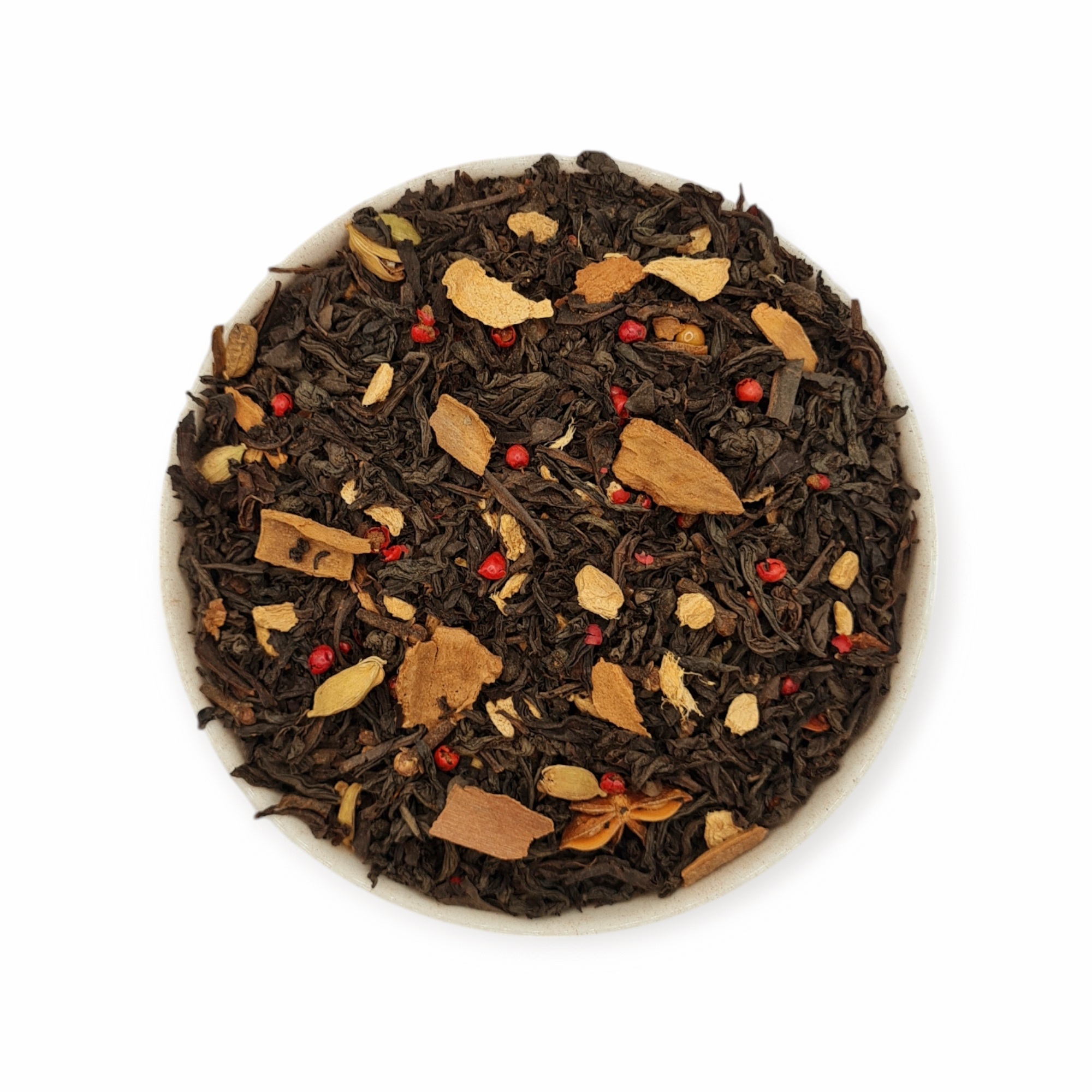 Składniki: herbata czarna Ceylon OP, imbir, kora cynamonu, anyż, kardamon, goździki, czerwony pieprz, gałka muszkatołowa, cynamon mielony.