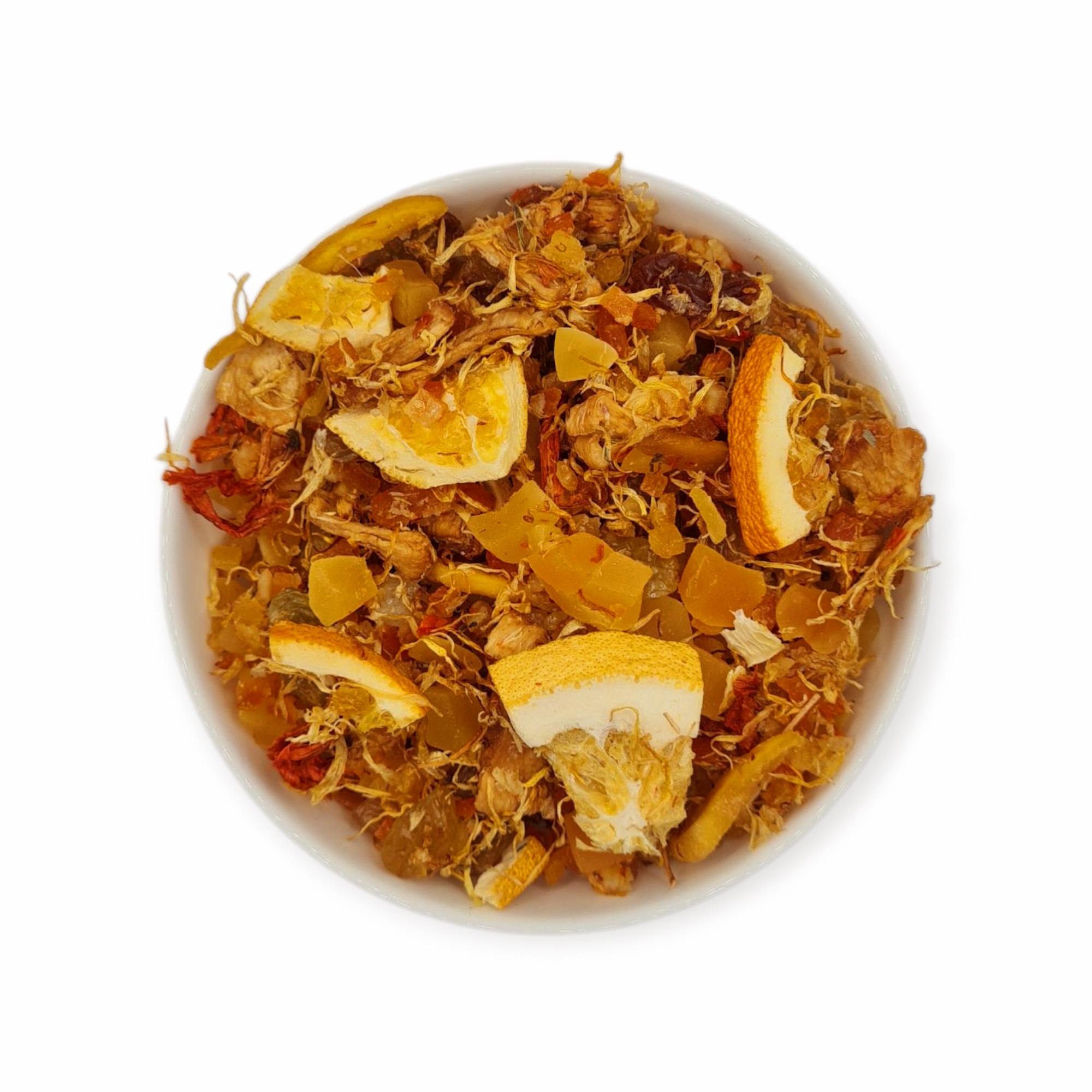 Złociste kawałki mango, kandyzowana pomarańcza oraz suszony ananas tworzą kompozycję, która oczaruje Cię zarówno aromatem, jak i smakiem. Do tego słodkie rodzynki Golden Jumbo, które doskonale balansują cytrusową nutę, nadają herbacie subtelną słodycz. Liofilizowane kawałki pomarańczy dostarczają cennych wartości odżywczych, jak świeża pomarańcza, a płatki nagietka i lilii dodają elegancji i subtelnego uroku.