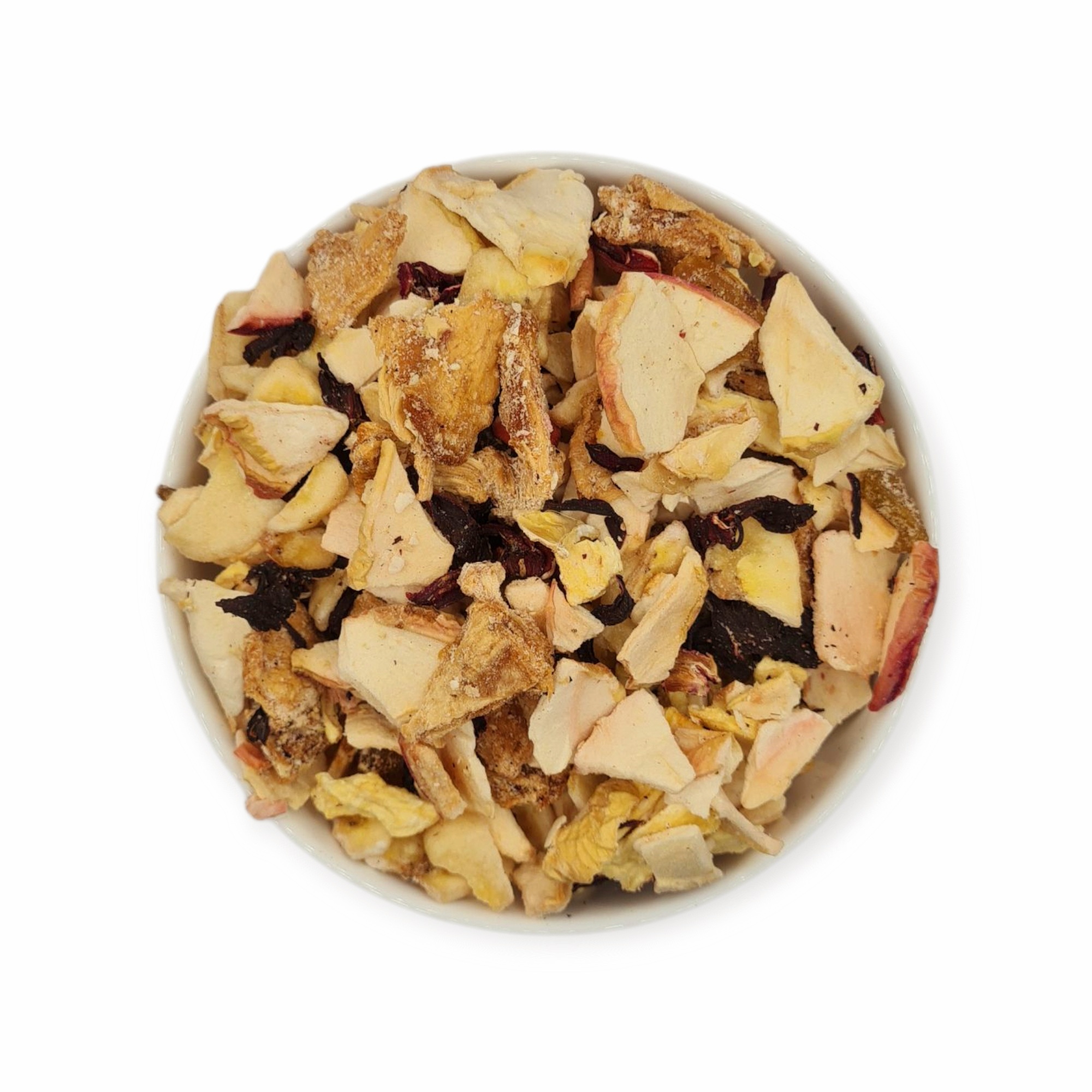 Głównym bohaterem tej mieszanki jest oczywiście ananas – i to w dwóch pysznych wersjach: suszonej (bez dodatku cukru!) i liofilizowanej. Towarzyszą mu inne owoce: jabłko, banan, rodzynki, a także lekko kwaskowy hibiskus. Całość to kompozycja bez sztucznych aromatów – naturalna i bezpieczna nawet dla najmłodszych smakoszy.