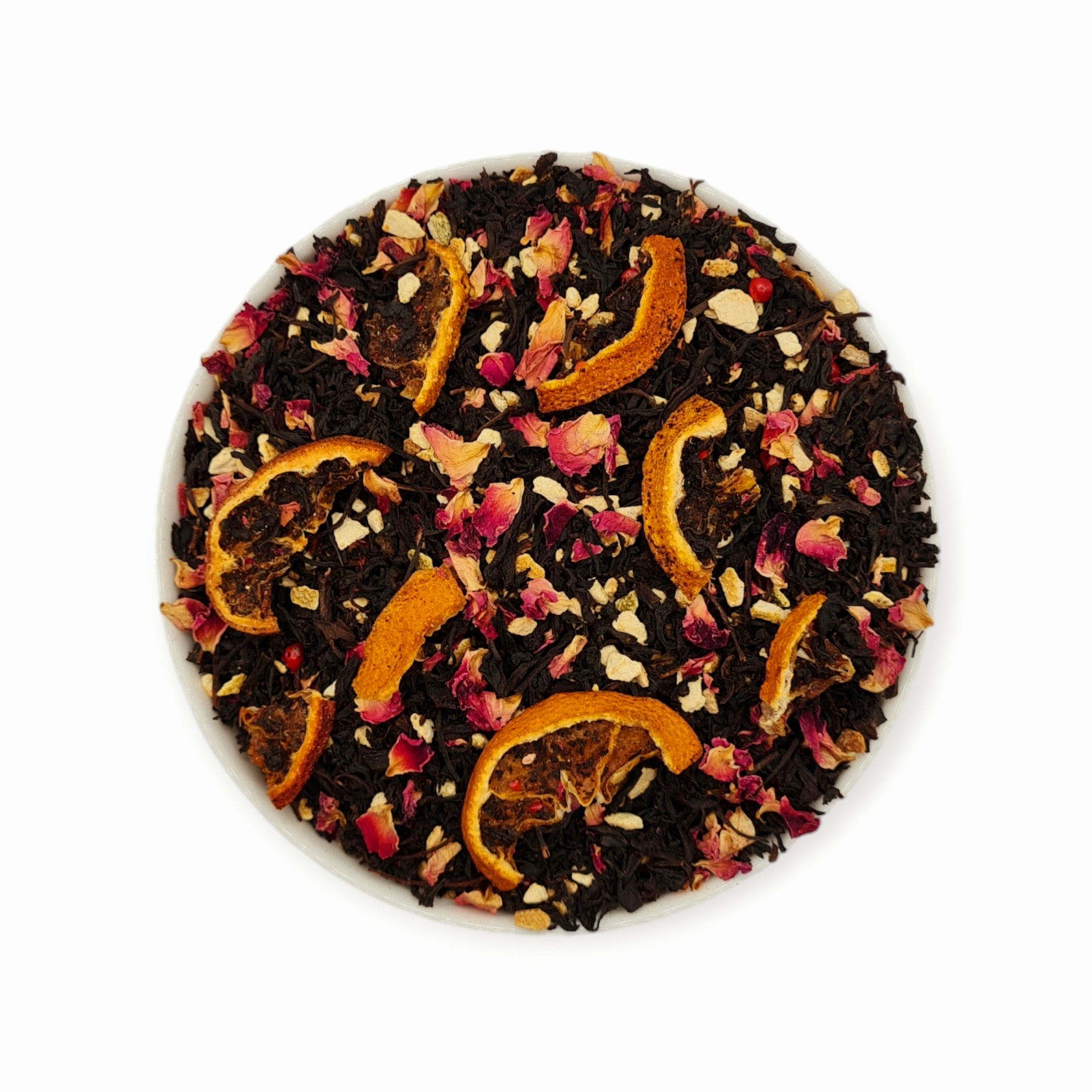 Składniki: herbata czarna Indie OP, skórka pomarańczy, aromat, mandarynka, płatki róży, pieprz czerwony.