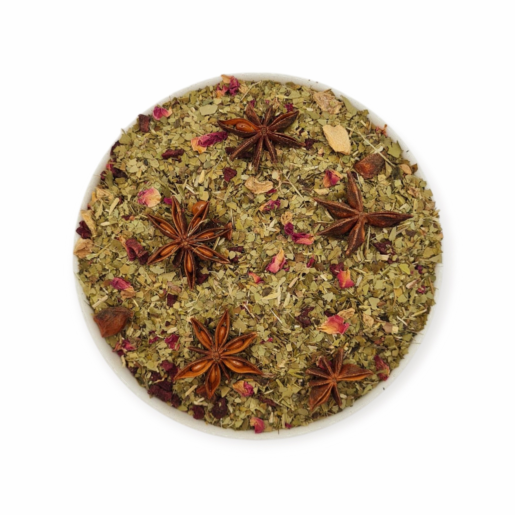 Składniki: yerba mate, anyż, imbir, burak, mięta, lukrecja, płatki róży.