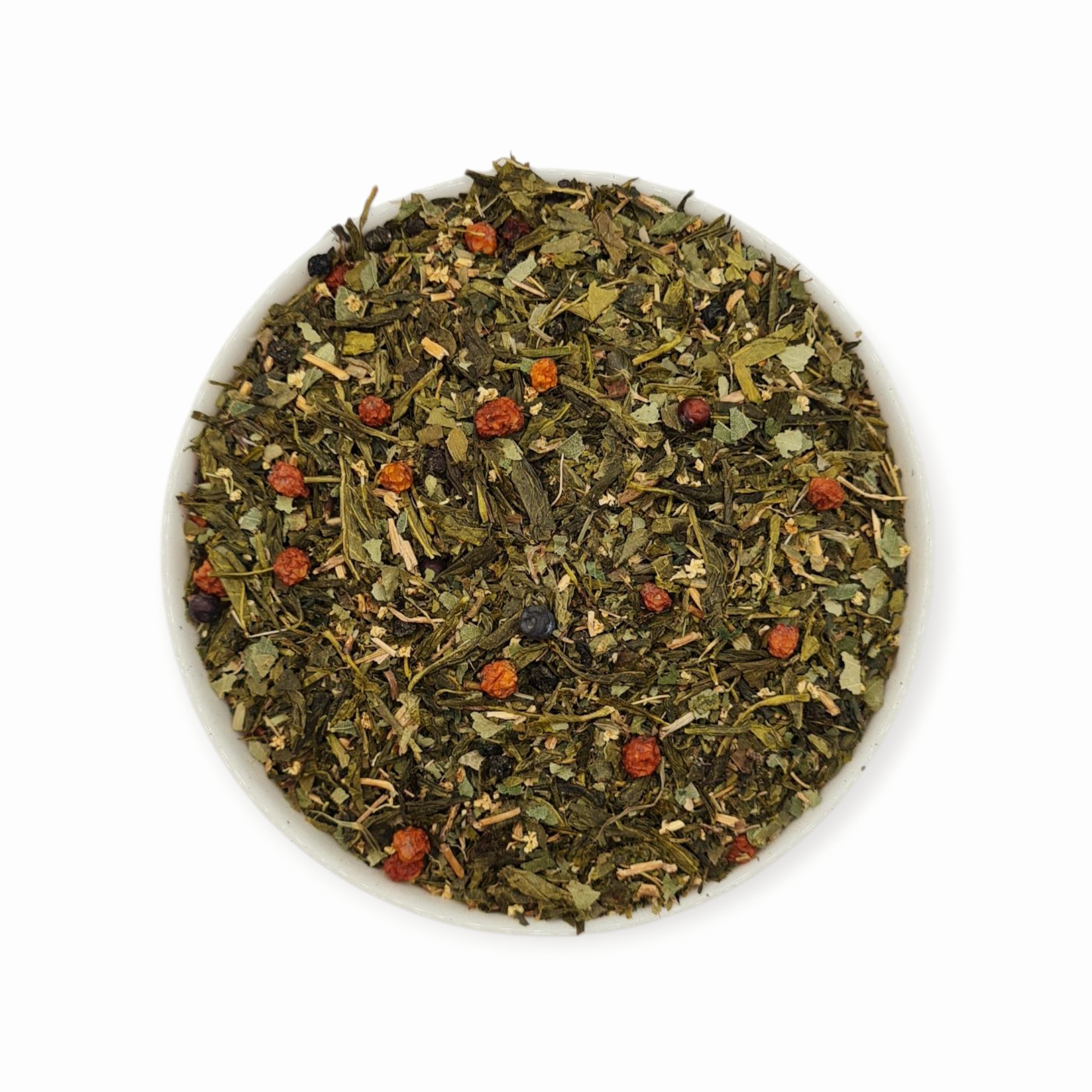 Składniki: herbata zielona Secha, kłącze perzu, liść brzozy, pokrzywy, jeżyny, poziomki, kwiat bzu czarnego, owoc jałowca, bzu czarnego i jarzębiny.