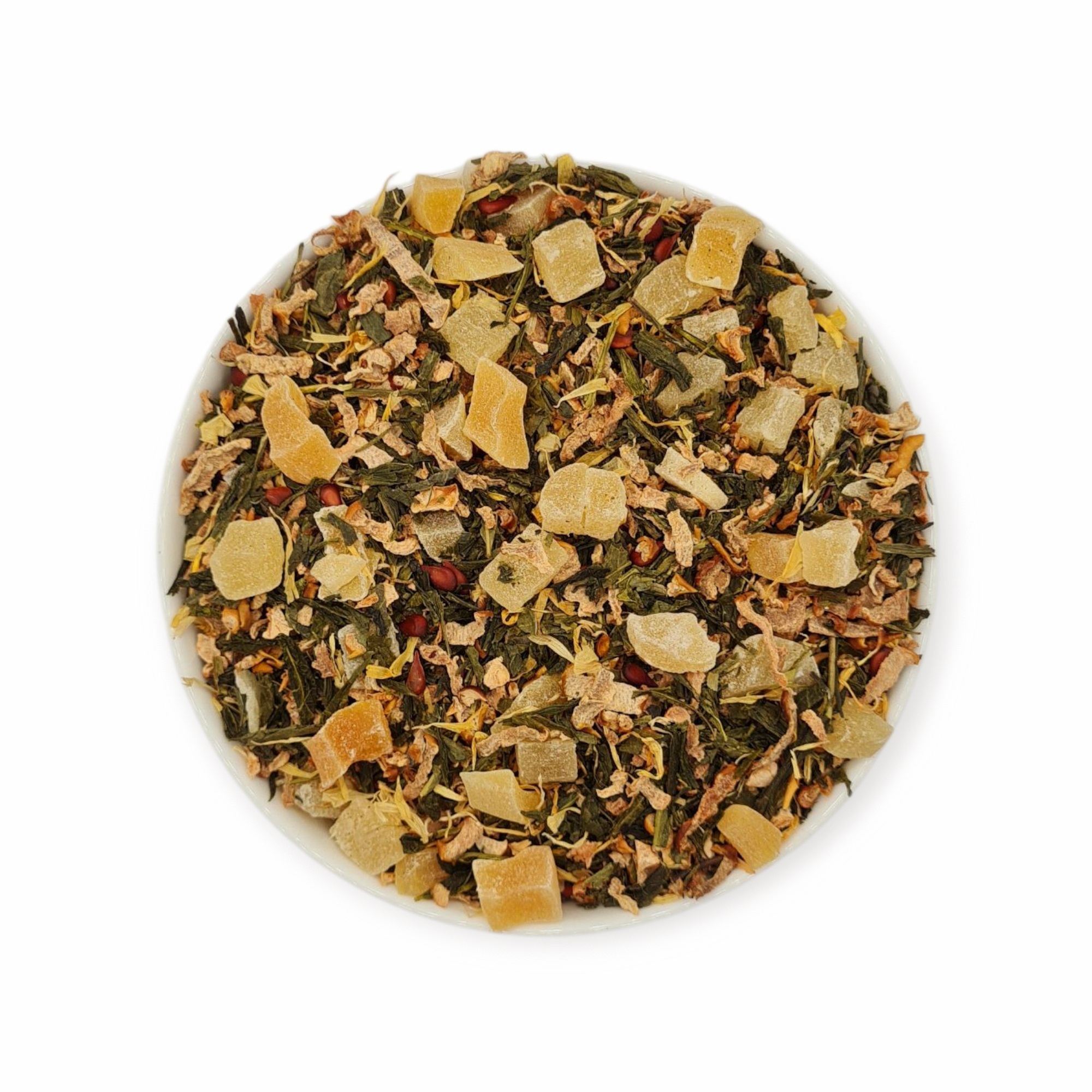 Kompozycję wzbogaca szlachetna zielona herbata Sencha, pełna polifenoli i antocyjanów, która nadaje naparowi głębi. Kwaśność pigwowca została zbalansowana tropikalnymi owocami o łagodnym smaku – ananasem i mango – co tworzy harmonijną i orzeźwiającą całość.