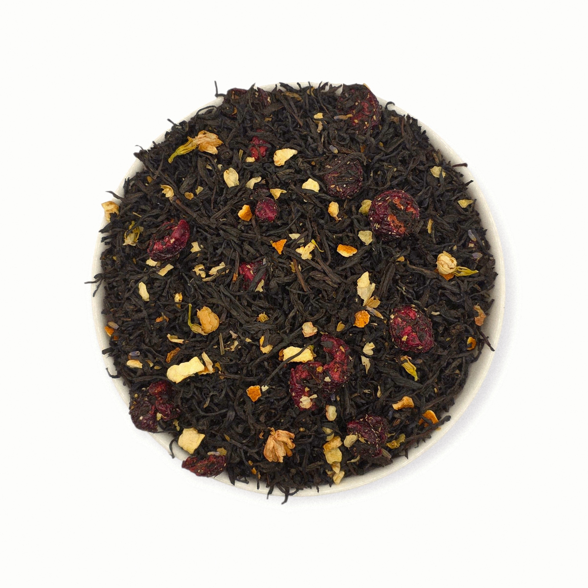 Składniki: herbata czarna Yunnan, wiśnia liofilizowana (połówki), skórka pomarańczy, aromaty, kwiaty jaśminu, kwiaty lawendy.