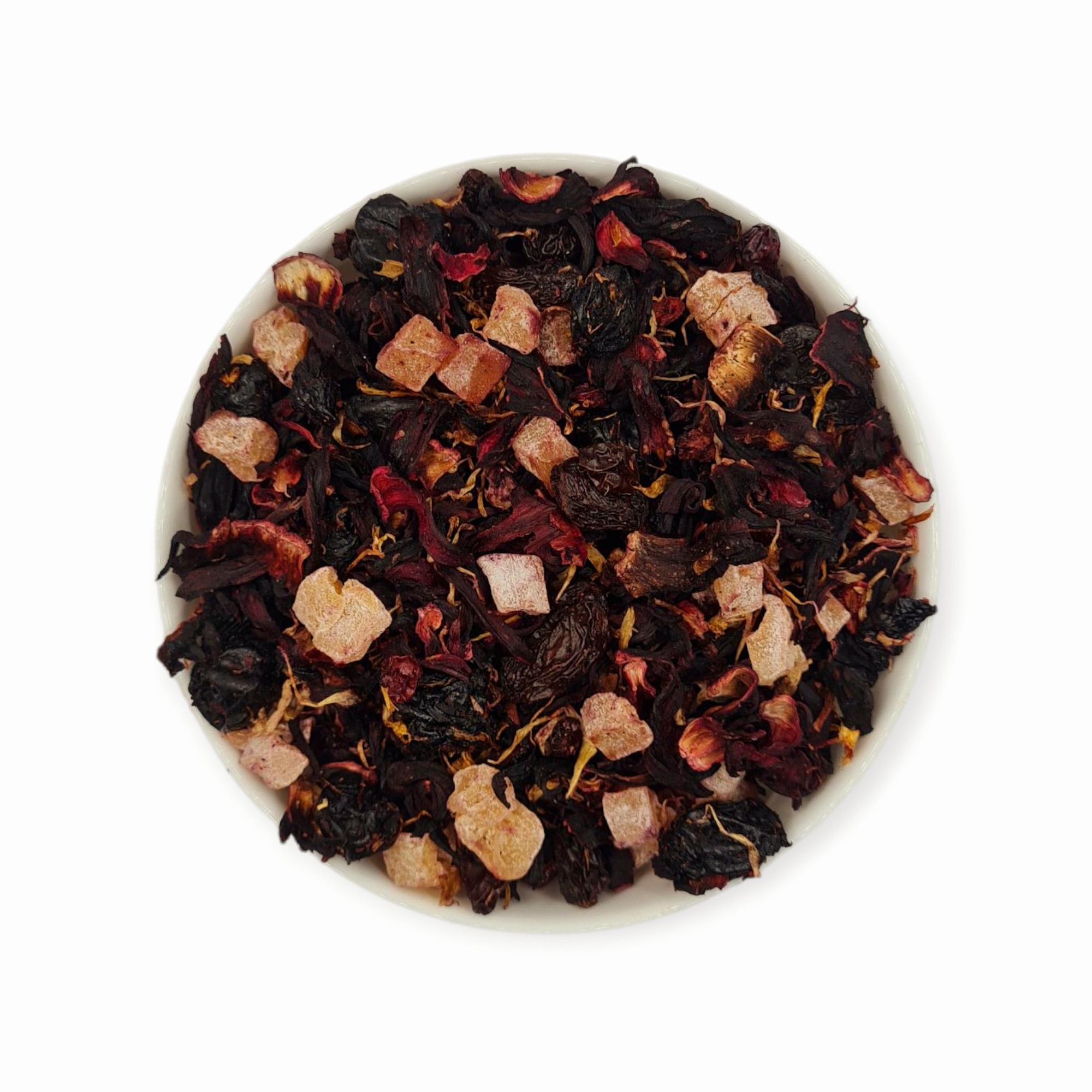 Składniki: hibiskus, mango kandyzowane, wiśnie suszone (19%), rodzynki, cukier, aromaty, porzeczka czerwona liofilizowana, wiśnia liofilizowana (2%), płatki nagietka, regulator kwasowości E330, olej roślinny, substancja konserwująca E223.