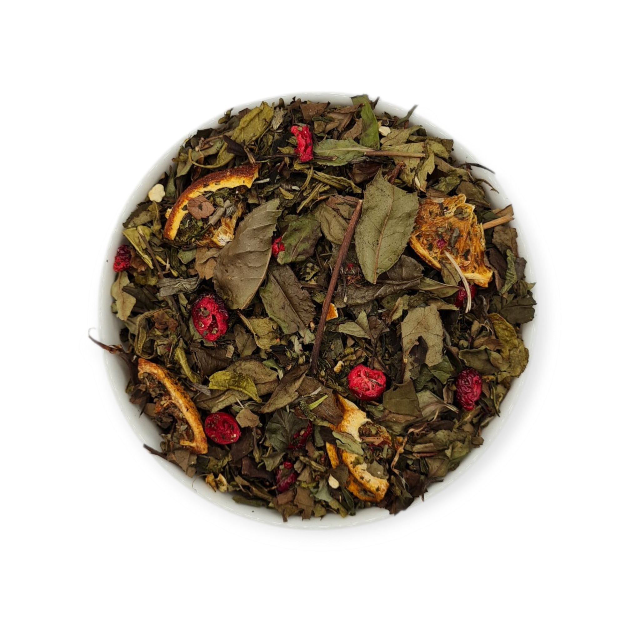 Składniki: herbata biała Pai Mu Tan, herbata zielona sencha, suszona pomarańcza ćwiartki, suszona skórka pomarańczy, aromat, żurawina liofilizowana.