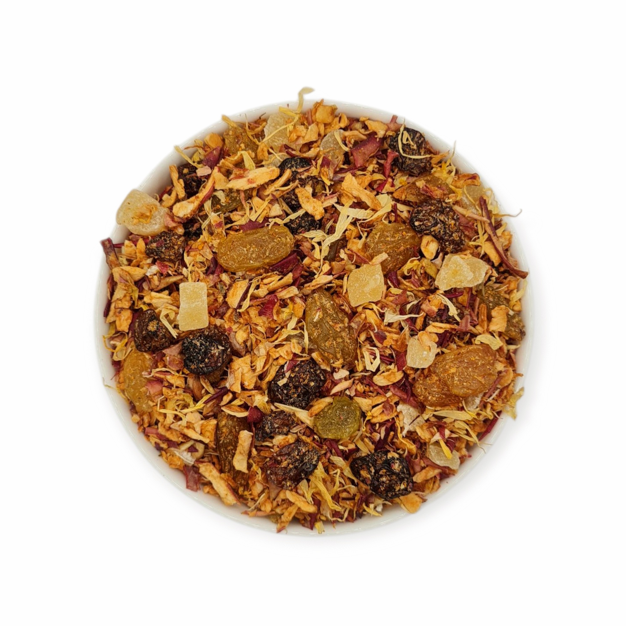 Składniki: suszone jabłko, kandyzowany ananas (ananas, cukier, przeciwutleniacz E330, substancja konserwująca E220), miechunka, rodzynki, liofilizowana mandarynka, płatki nagietka, kurkuma.