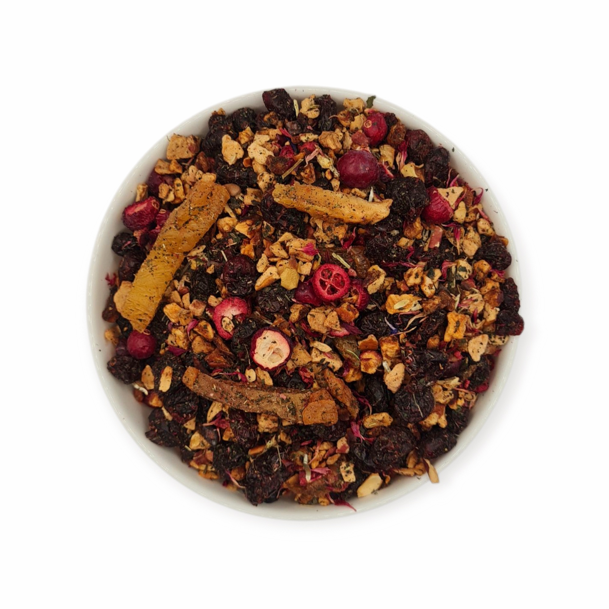 Składniki: żurawina kandyzowana (48%), jabłko suszone, gruszka kandyzowana, liście pokrzywy, żurawina liofilizowana (2%), aromat, płatki bławatka różowego, olej słonecznikowy, substancja konserwująca E220.