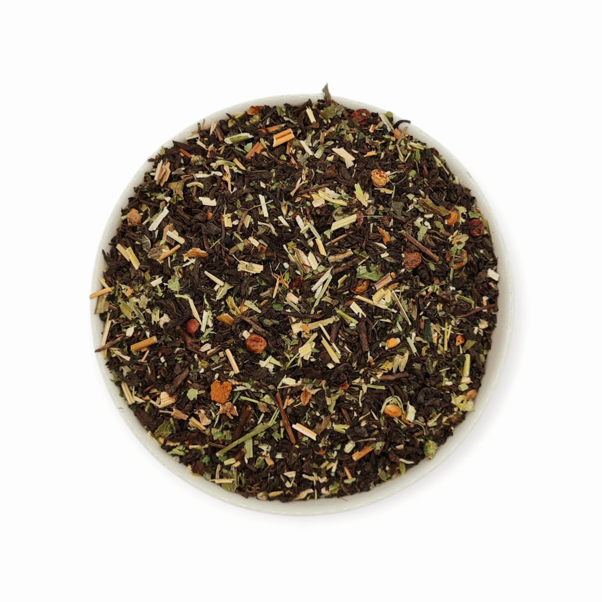Skład: herbata czerwona Pu Erh, owoc głogu (20%!), ziele owsu, nasiona marchwi, liść pokrzywy, ziele bukwicy, ziele serdecznika, ziele ostrożenia, ziele gryki, ziele nostrzyka, liść mięty.